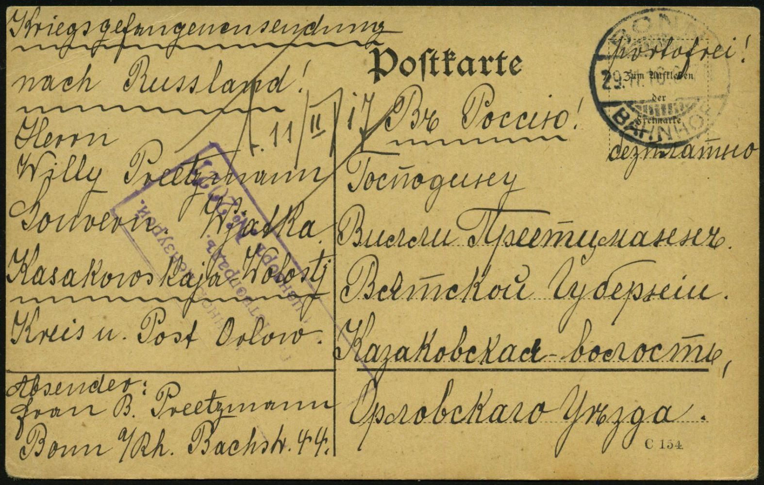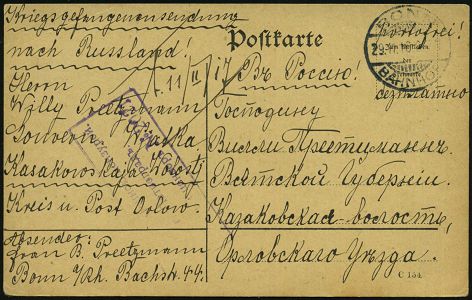 9807 | 28 € | 5300 BONN (Allgem. Belege, Tagesstempel, Ganzsachen etc.) : BONN/ BAHNHOF 1916 (29.11.) 1K-Gitter + russ. Zensur-Ra.3: Lager No. 2021 = Kasakowskaja Distr. Orlow (nicht ganz voll) portofreie Kriegsgefangenen-Zenur-Kt. Text über Friedenssehnsucht!, nicht beanstandet! n. Orlow (Wo.1) | ![]() ![]() | |