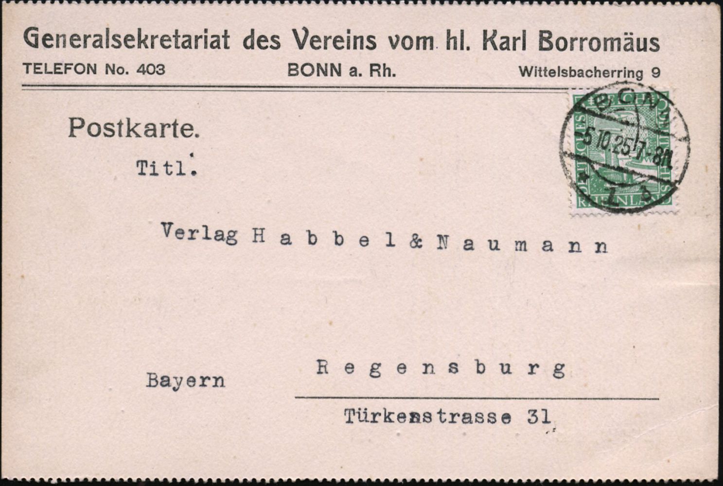 9809 | 16 € | 5300 BONN (Allgem. Belege, Tagesstempel, Ganzsachen etc.) : BONN/ *1b 1925 (5.10.) 1K-Brücke auf 5 Pf. "1000 Jahre Rheinland" , Vordruck-Kt.: Generalsekretariat des Vereins vom hl. Karl Borromäus | ![]() | |