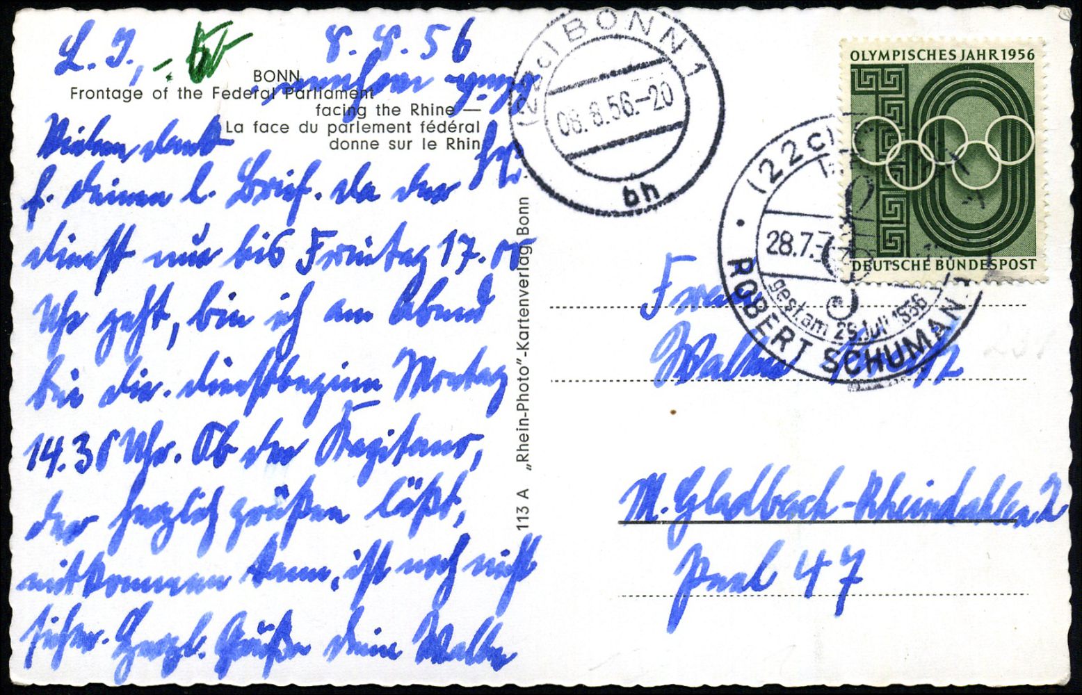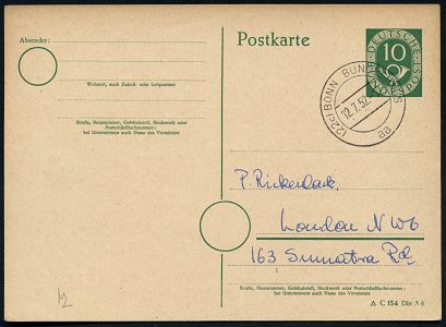9819 | 18 € | 5300 BONN (Allgem. Belege, Tagesstempel, Ganzsachen etc.) : (22a) BONN BUNDESHAUS/ a a 1952 (12.7.) 2K-Steg = Hauspostamt Parlament auf Ausl.-Drs.-Karte 10 Pf. Posthorn n. England (Mi.P 12) | ![]() | |