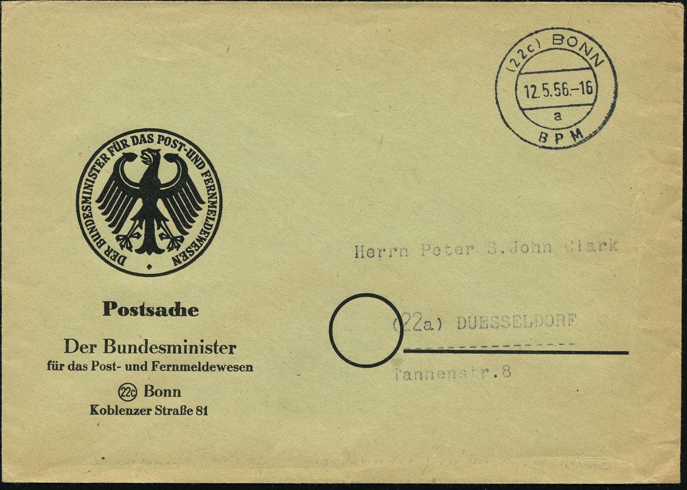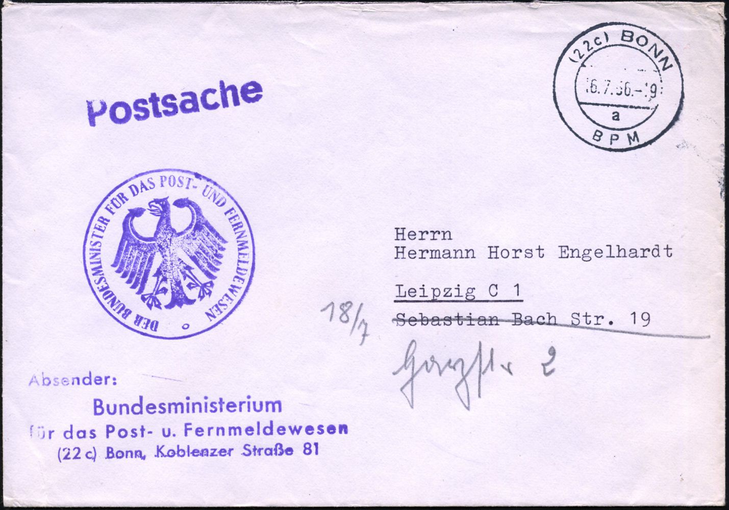9822 | 20 € | 5300 BONN (Allgem. Belege, Tagesstempel, Ganzsachen etc.) : (22c) BONN/ a/ B P M 1956 (16.7.) 2K-Steg = Hauspostamt B undes-Post-Ministerium + viol. 1K-HdN: DER BUNDESMINISTER FÜR DAS POST- U. FERNMELDEWESEN + viol. Abs.-4L, Postdienstbf. in die DDR! n. Leipzig | ![]() | |