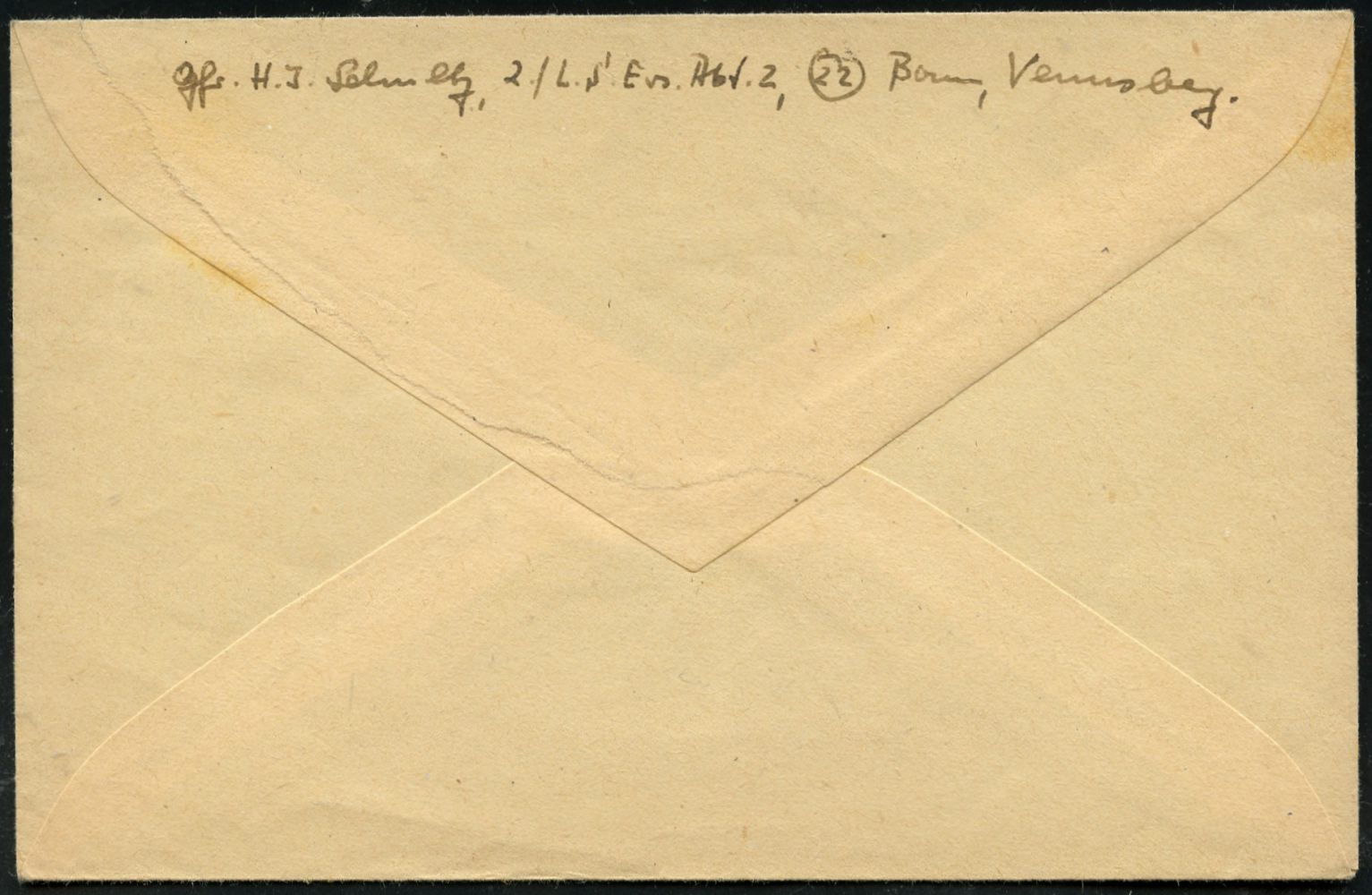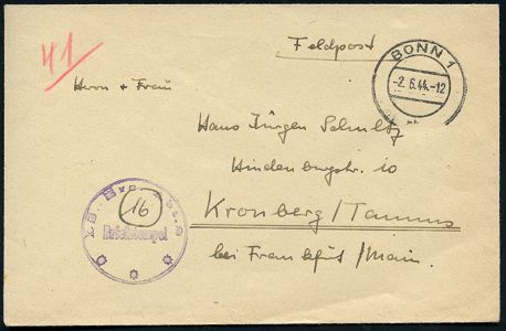 9816 | 15 € | 5300 BONN (Allgem. Belege, Tagesstempel, Ganzsachen etc.) : BONN 1/ ab 1944 (2.6.) 2K-Steg + viol. 1K-HdN: L. S. Ers. Abt. 2/*** = Luftschutz Ersatz Abteilung 2 , rs. hs. Abs., Feldpost-Bf. (rs. Klappenriß) n. Kronberg | ![]() ![]() | |