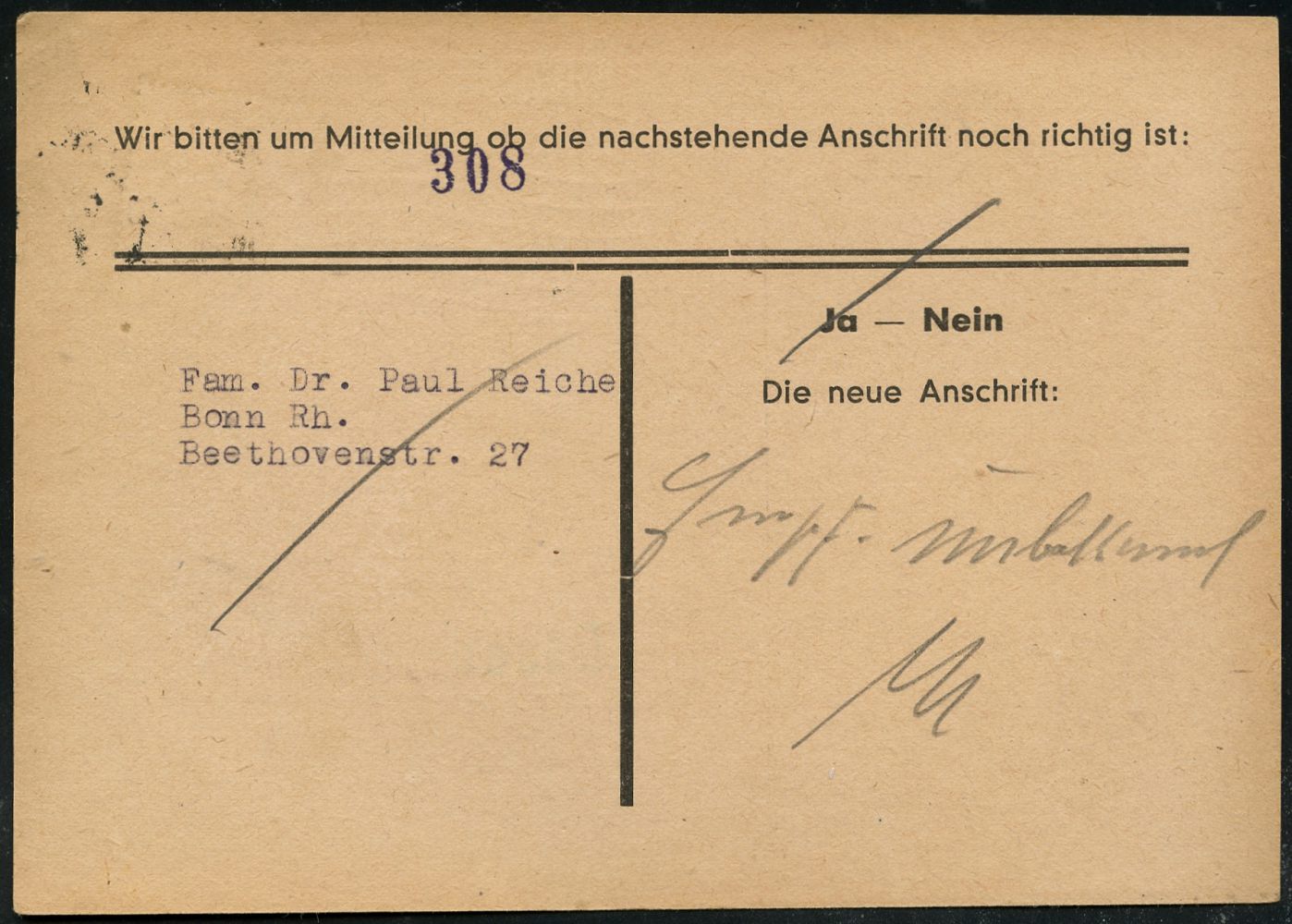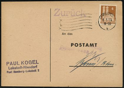 9817 | 25 € | 5300 BONN (Allgem. Belege, Tagesstempel, Ganzsachen etc.) : Postamt Bonn 1950 (5.1.) viol. Retour-2L + viol. 1L: Zurück (Bonn) auf Anschriften-Prüfung aus Hamburg , EF 4 Pf. Bauten (MaWellenSt. Hamburg) n. Bonn (Mi.74 eg, EF) | ![]() ![]() | |