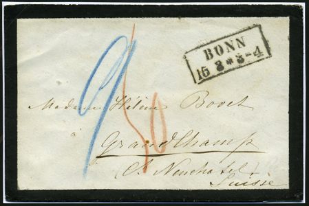 9800 | 30 € | 5300 BONN (Allgem. Belege, Tagesstempel, Ganzsachen etc.) : BONN 1864 (15.3.) schw. Ra.2 + Rötelvermerks + hs. "9" , klar gest. Nachgebühr- M i n i a t u r - Trauerbf. in die Schweiz! (Format 10,5 x 7,3 cm) | ![]() | |