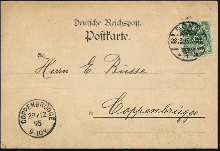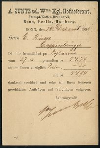 9801 | 30 € | 5300 BONN (Allgem. Belege, Tagesstempel, Ganzsachen etc.) : BONN/ * 1 b 1895 (28.12.) 1K-Gitter auf EF 5 Pf. Krone/Ziffer, grün mit früher Firmenlochung "Z Ww" = Z untz sel. Witwe (Dampf-Kaffee-Brennerei) Firmenkt., rs. dekorat. Vordruck n.Coppenbrügge, vs. AS (Mi.46 EF Perfin) | ![]() ![]() | |