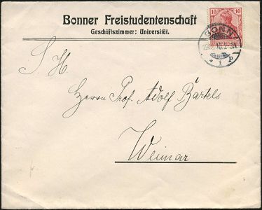 9803 | 20 € | 5300 BONN (Allgem. Belege, Tagesstempel, Ganzsachen etc.) : BONN/ *1p 1910 (19.12.) 1K-Gitter auf Vordruck-Bf.: Bonner Freistudentenschaft..Universität , Inl.-Bf. an Prof. Adolf Bartels, Weimar = Gründer Deutscher Schillerbund (Mi.86 I) | ![]() | |