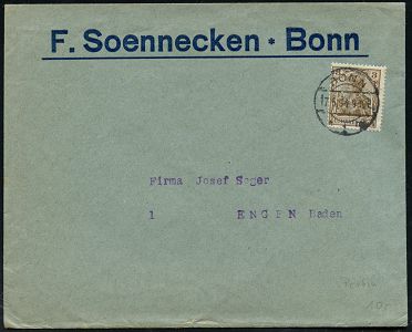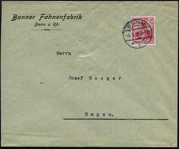 9804 | 15 € | 5300 BONN (Allgem. Belege, Tagesstempel, Ganzsachen etc.) : BONN/ *1b 1912 (4.5.) 1K-Brücke auf EF 10 Pf. Germania mit Firmenlochung: "B. F. / B." = B onner Fahnenfabrik Bonn , klar gest. Firmen-Fernbf. (Mi.86 I EF , Perfin) | ![]() | |
