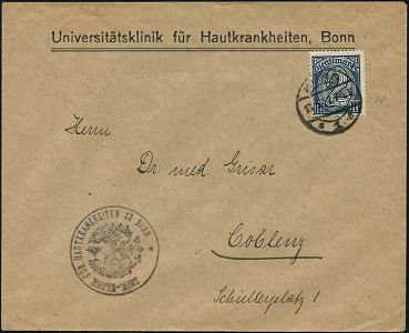 9808 | 16 € | 5300 BONN (Allgem. Belege, Tagesstempel, Ganzsachen etc.) : BONN/ *1l 1922 (10.5.) 1K-Brücke auf EF 2 Mk Dienst + viol. aptierter HdN: UNIV.-KLINIK FÜR HAUTKRANKHEITEN ZU BONN (noch mit kaiserl. Adler!) Dienst-Bf. n. Koblenz (Mi.D 32 EF) | ![]() | |