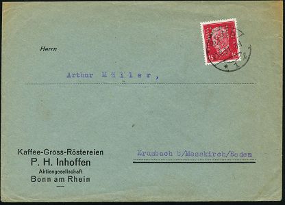 9811 | 16 € | 5300 BONN (Allgem. Belege, Tagesstempel, Ganzsachen etc.) : BONN/ *1l 1931 (20.8.) 1K-Brücke auf EF 15 Pf. Hindenbg. mit Firmenlochung "P H / I" = P.H. I nhoffen AG. Kaffee-Groß-Rösterei, Firmen-Bf. (Mi.414, EF Perfin) | ![]() | |