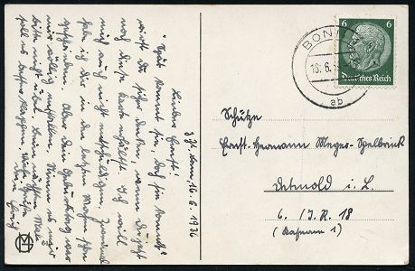 9813 | 15 € | 5300 BONN (Allgem. Belege, Tagesstempel, Ganzsachen etc.) : BONN 1/ ab 1939 (16.6.) 2K-Steg auf EF 6 Pf. Hindenbg., klar gest. Fernkt. an: 6/ Jnf. Rgt. 18 , Detmold, während des bevorstehenden Polen-Feldzuges Grenzsicherung West (Feldpost erst ab 3.8.1939), OB West ab 4.11.1938 war von Rundstedt (Mi.516) | ![]() | |