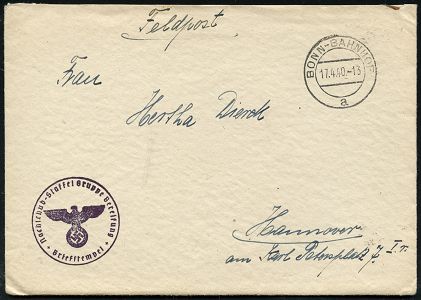 9814 | 16 € | 5300 BONN (Allgem. Belege, Tagesstempel, Ganzsachen etc.) : BONN-BAHNHOF/ a 1940 (17.4.) 2K-Steg + HdN: Nachschub-Staffel Gruppe Bereifung , klar gest. Feldpost-Bf. mit Inhalt! n. Hannover (2 Belege kpl.) | ![]() ![]() | |