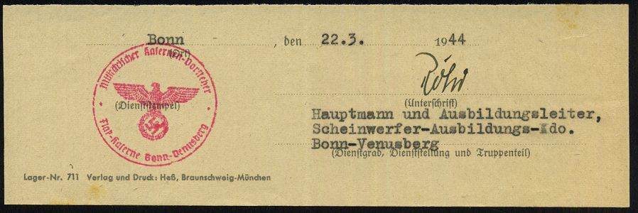 9815 | 18 € | 5300 BONN (Allgem. Belege, Tagesstempel, Ganzsachen etc.) : Bonn-Venusberg 1944 (22.3.) roter 1K-HdN: Flak-Kaserne Bonn-Venusberg/ Militärischer Kasernen-Vorsteher auf Quittungs-Abschnitt "Scheinwerfer-Ausbildungs-Kdo." (Format 17,8 x 5,8 cm) | ![]() | |