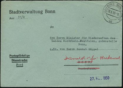 9818 | 20 € | 5300 BONN (Allgem. Belege, Tagesstempel, Ganzsachen etc.) : (22c) BONN BUNDESHAUS/ a 1951 (24.8.) 2K-Steg = Hauspostamt Bundestag auf nachgesandten, markenlosem Dienst-Bf.: Stadtverwaltung Bonn nach Düsseldorf weitergeleitet | ![]() | |