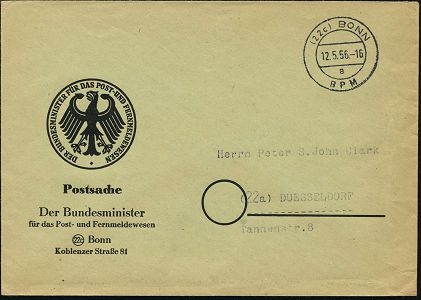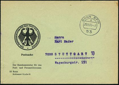 9824 | 16 € | 5300 BONN (Allgem. Belege, Tagesstempel, Ganzsachen etc.) : 53 BONN B P M / a 1963 (11.11.) 1K-Segment = B undes-Post-Ministerium, = Hauspostamt Bundespost-Ministerium!, Dienst-Bf.: DER BUNDESMINISTER FÜR DAS POST- U. FERNMELDEWESEN (Bundesadler) | ![]() | |