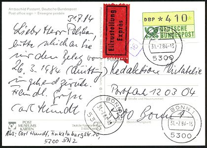 9826 | 16 € | 5300 BONN (Allgem. Belege, Tagesstempel, Ganzsachen etc.) : 5300 BONN 1/ j 1984 (31.7.) 1K-Segment auf EF ATM 410 Pf. Bedarfs-Eil-Orts-Ak. (Postschild) vs. AS.: 5300 BONN 1/af und 5300 BONN 12 (Mi.1 EF) | ![]() ![]() | |