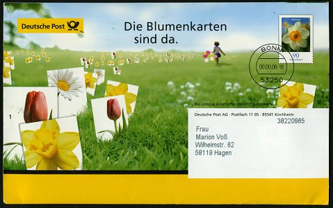 9828 | 12 € | 5300 BONN (Allgem. Belege, Tagesstempel, Ganzsachen etc.) : 53250 BONN 2006 Buchdruck-Tagesstempel ohne Tag/Monat auf DUB 90 C. "Narzisse" Die Blumenkarten sind da. + Inhalt: Blumenmotive (Tulpen etc.) 2 Belege kompl. | ![]() ![]() | |