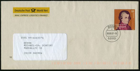 9829 | 11 € | 5300 BONN (Allgem. Belege, Tagesstempel, Ganzsachen etc.) : 53113 BONN/ a 2007 Buchdruck-Tagestempel ohne Tag/Monat auf DUB 55 C. "250. Geburtstag Mozart": Deutsche Post..MAIL EXPRESS LOGISTICS FINANCE , Inl.-Postdienst-Umschlag | ![]() | |