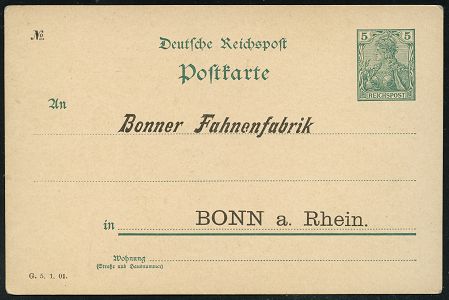 9802 | 20 € | 5300 BONN (Allgem. Belege, Tagesstempel, Ganzsachen etc.) : Bonn 1901 Inl.-P 5 Pf. Germania "Reichspost", grün mit Firmen-Zudruck: Bonnen Fahnenfabrik.. (rs. ohne Text) ungebr. mit Druckdatum 1.01 (Mi.PZD 50 II) | ![]() | |