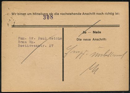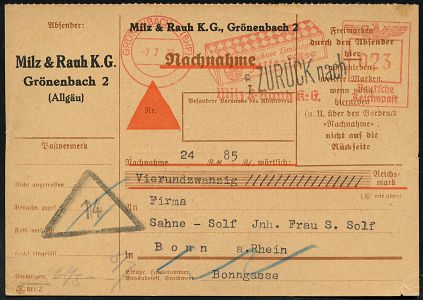 9812 | 20 € | 5300 BONN (Allgem. Belege, Tagesstempel, Ganzsachen etc.) : Bonn 1938 (7.7.) schw. 1L: B 7/ ZURÜCK nach = Retourstempel von Bonn auf Inl.-NN-Retour-Kt. mit AFS: GRÖNENBACH (BHF)/Allgäuer Limburger/..Milz & Rauh KG (023 Pf.) n. Bonn | ![]() | |