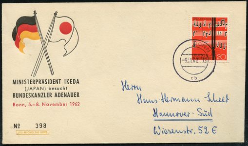 9823 | 16 € | 5300 BONN (Allgem. Belege, Tagesstempel, Ganzsachen etc.) : BONN 1/ cb 1962 (5.11.) aptierter 2K-Steg = alte PLGZ (22 c) entfernt, da Einfühung neuer Postleitzahlen , Inl.-Sonderumschlag: MINISTERPRÄSIDENT IKEDA (JAPAN) besucht BUNDESKANZLER ADENAUER.. (2 Flaggen) n. Hannover | ![]() | |