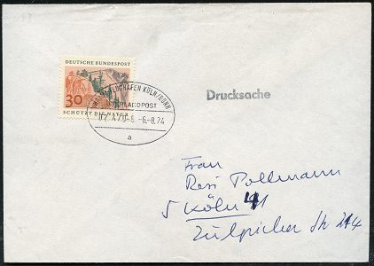 9825 | 15 € | 5300 BONN (Allgem. Belege, Tagesstempel, Ganzsachen etc.) : HAMM -FLUGHAFEN KÖLN-BONN/ ÜBERLANDPOST/ 02 / 070/ a 1974 (6.8.74) Oval-Brücke = mobiles Postamt im Post-Omnibus auf Fern-Bf. n. Köln | ![]() | |
