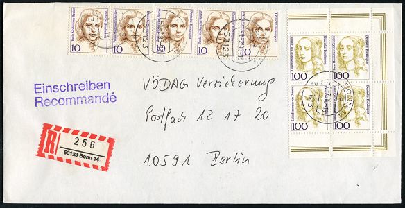 9827 | 16 € | 5300 BONN (Allgem. Belege, Tagesstempel, Ganzsachen etc.) : 53123 BONN 14/ a 1995 (1.2.) 1K-Segment mehrfach auf satzreiner Frankatur "Frauen" 4er-Block H. v. Oranien u. 5x 10 Pf. Paula Modersohn-Becker + RZ: 53123 Bonn 14, sauber gest. Inl.-R-Bf. | ![]() | |