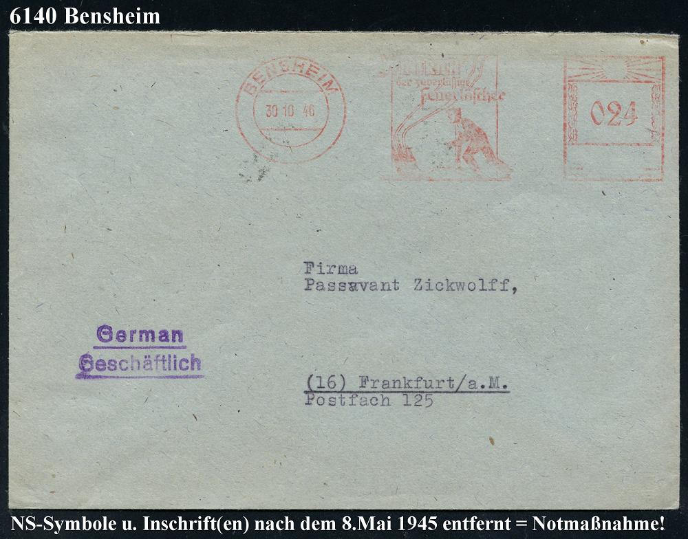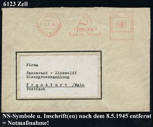 1248 | 28 € | POSTLEITRAUM 6100 (OHNE DARMSTADT) : ZELL/ (Kr.ERBACH ODENW)/ "Imaz"/ Jakob Maul 1946 (10.7.) seltener, aptierter AFS Francotyp "Hakenkreuz" = entfernt + "Deutsches Reich" = Notmaßbahme! (auch Zeile "Briefwaagen - Büroartikel" wurde entfernt! (vergl. Nr.1247) Fern-Bf. (Dü.E-12 Q-98o) | ![]() | |