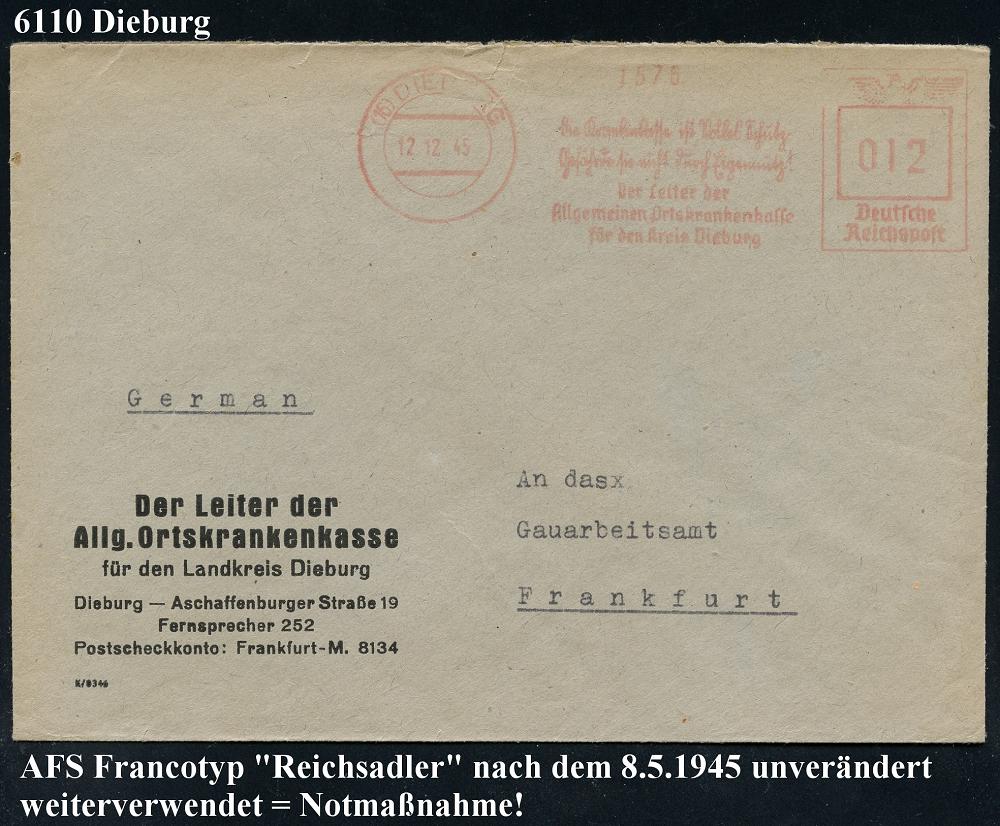 1187 | 25 € | POSTLEITRAUM 6100 (OHNE DARMSTADT) : DIEBURG/ die Krankenkasse ist Volkes Schutz../ Allgem.Ortskrankenkasse/ für den Kreis Dieburg 1945 (12.12.) AFS FRancotyp "Reichsadler" unverändert weiterverwendet! = Notmaßnahme (Text teils in Sütterlin) Vordruck-Bf.: Der Leiter der Allg. Ortskrankenkasse.. (Dü.E-5CGo, unverändert!) | ![]() | |
