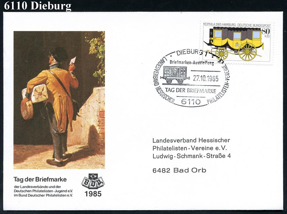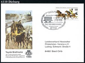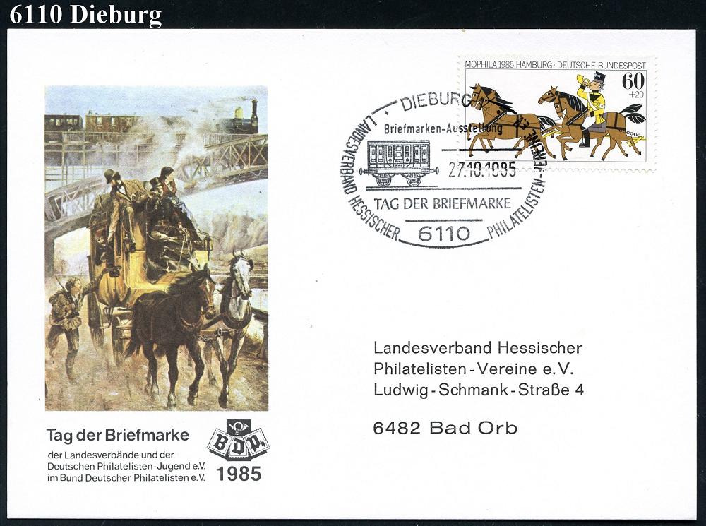 1189 | 5 € | POSTLEITRAUM 6100 (OHNE DARMSTADT) : 6110 DIEBURG 1/ TAG DER BRIEFMARKE 1985 (27.10.) SSt. (Bahnpostwagen) auf EF 60 + 20 Pf. MOPHILA auf Sonder-Kt.: Tag der Briefmarke (Postkutsche u. Bahn-Viadukt) SU (Mi.1255) | ![]() | |
