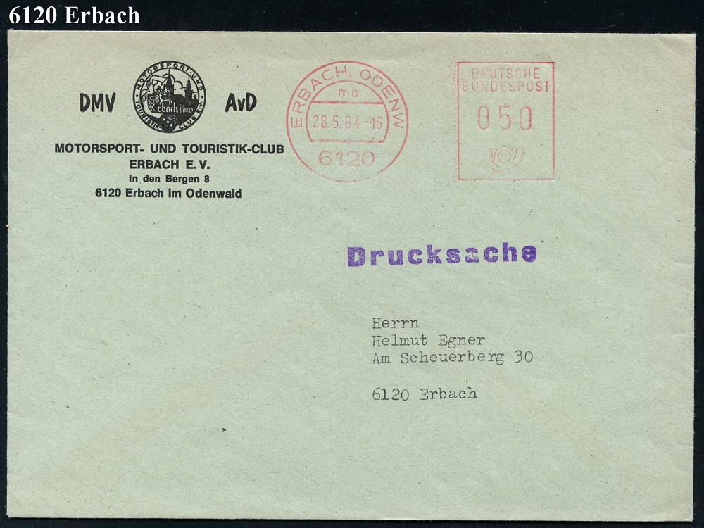 1194 | 6 € | POSTLEITRAUM 6100 (OHNE DARMSTADT) : 6120 ERBACH,ODENW/ mb/ DEUTSCHE/ BUNDESPOST 1984 (28.5.) PFSstilis. "Posthorn" 050 Pf. auf illustriertem Vordruck-Bf.: DMV AvD, MOTORSPORT- U. TOURISTIK-CLUB ERBACH EV... | ![]() | |
