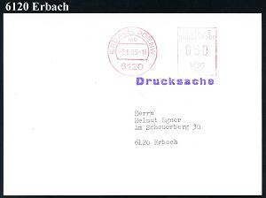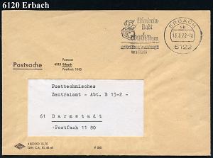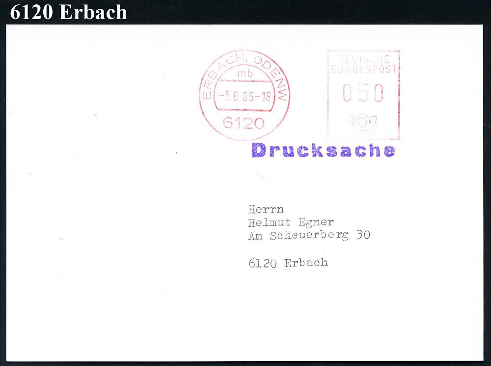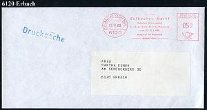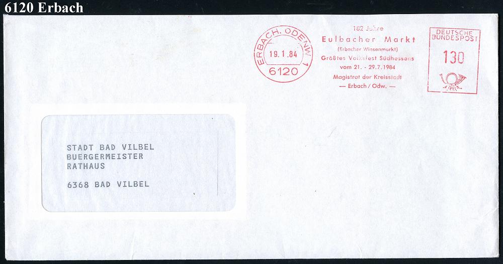 1200 | 14 € | POSTLEITRAUM 6100 (OHNE DARMSTADT) : 6120 ERBACH,ODENW 1/ Eulbacher Markt/ (Erbacher Wiesenmarkt)/ ..21.-29.7.1984 1984 (19.1.) temporärer AFS Francotyp des Magistrats auf Fern-Bf. (Dü.E-23CO) | ![]() | |