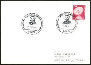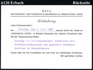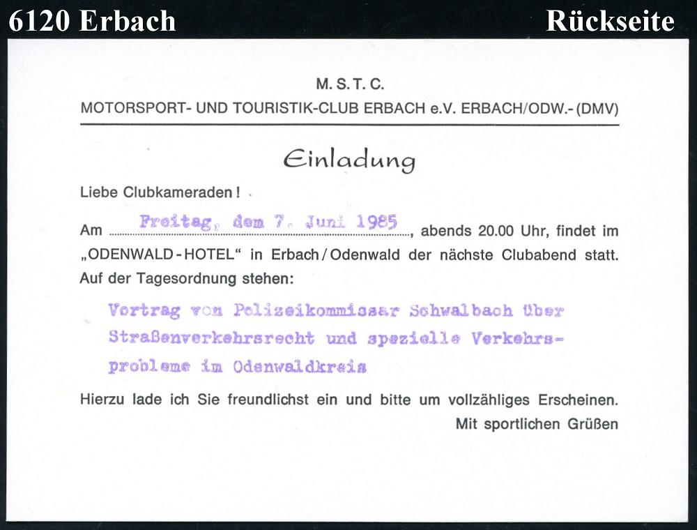 1195 | 5 € | POSTLEITRAUM 6100 (OHNE DARMSTADT) : 6120 ERBACH,ODENW/ mb/ DEUTSCHE/ BUNDESPOST 1985 (3.6.) PFS stilis "Posthorn" 050 Pf. auf Einladungs-Kt.: MTSC, MOTORSPORT- U. TOURISTIK-CLUB ERBACH EV.. (Vortrag im Odenwald-Hotel) | ![]() ![]() | |