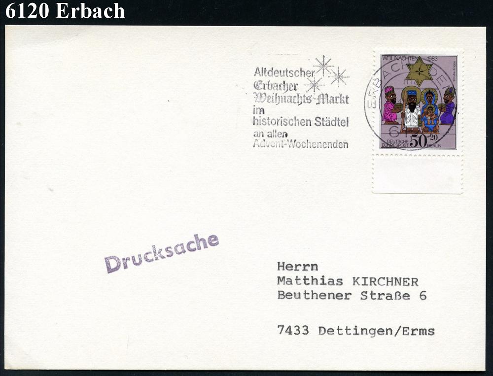 1199 | 12 € | POSTLEITRAUM 6100 (OHNE DARMSTADT) : 6120 ERBACH,ODENW/ ma/ Altdeutscher/ Erbacher/ Weihnachts-Markt.. 1983 (28.11.) MWSt (3 Sterne) auf EF 50 + 20 Pf. Weihnachten Berlin, Fern-Kt. | ![]() | |