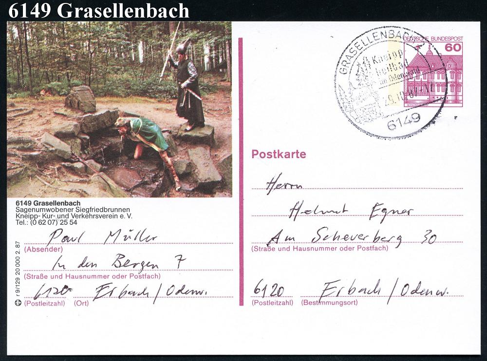 1201 | 15 € | POSTLEITRAUM 6100 (OHNE DARMSTADT) : 6149 GRASELLENBACH 2/ Kneipp-/ heilbad/ im Odenwald 1987 (29.10.) HWSt auf ortsgleicher BiP 60 Pf. Burgen: 6149 Grasellenbach.. Siegfriedbrunnen (Hagen u. trinkender Siegfried) Bedarf, seltene Kombination! (Mi.P 138) | ![]() | |