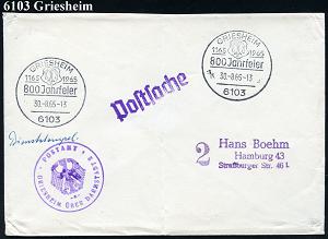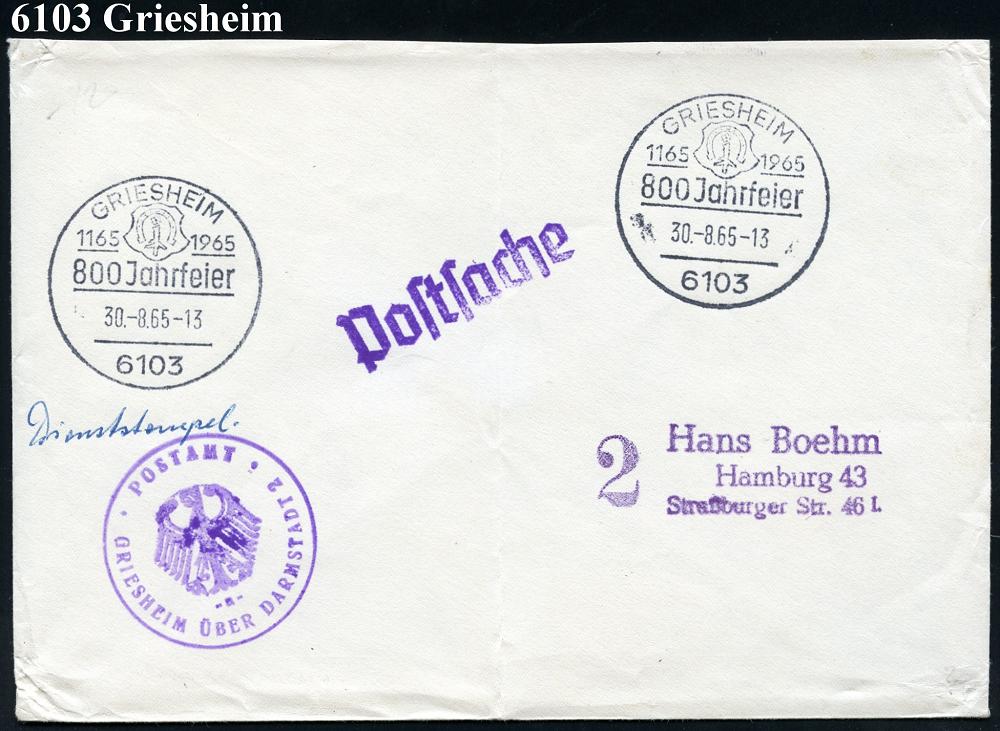 1202 | 14 € | POSTLEITRAUM 6100 (OHNE DARMSTADT) : 6103 GRIESHEIM/ 1165 1965/ 800 Jahrfeier 1965 (30.8.) HWSt 2x + viol. 1K-HdN: POSTAMT/GRIESHEIM ÜBER DARMSTADT 2/- a - (Bf gefaltet, da Antwort-Bf.) Postdienst-Bf.. weitere Griesheim-Belege siehe Darmstadt! (Bo.2) | ![]() | |