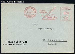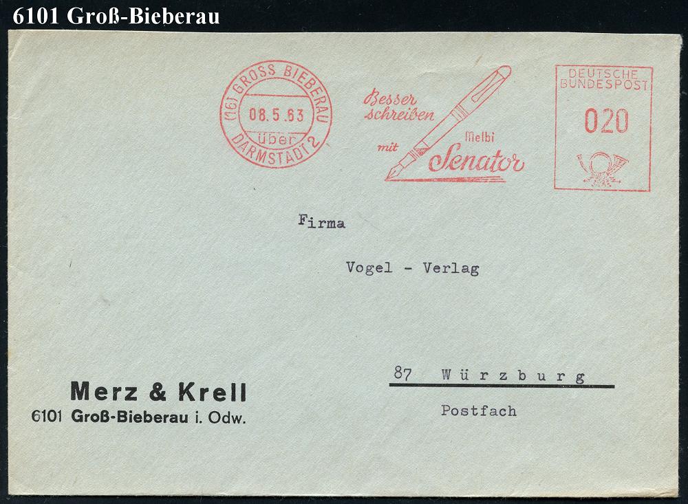 1204 | 18 € | POSTLEITRAUM 6100 (OHNE DARMSTADT) : (16) GROSS BIEBERAU/ über/ DARMSTADT 2/ Besser/ schreiben/ mit/ Melbi/ Senator 1963 (8.5.) AFS Francotyp "Posthorn" = PSt. I (Füllfederhalter) Firmen-Bf.: Merz & Krell.. (Dü.E-23CO, PSt.I-Typ) | ![]() | |