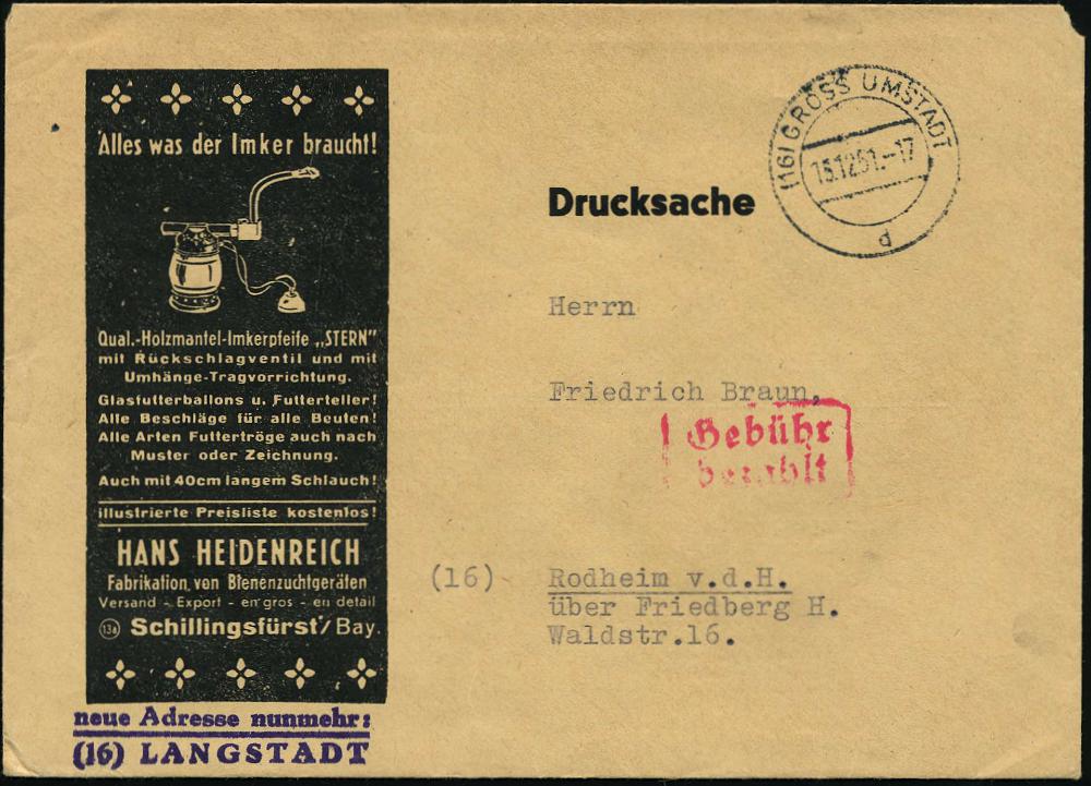 1205 | 20 € | POSTLEITRAUM 6100 (OHNE DARMSTADT) : GROSS UMSTADT/ d 1951 (15.12.) 2K-Steg + roter Ra.2: Gebühr/bezahlt, Reklame-Bf.: HANS HEIDENREICH.. Bienenzuchtgeräte , vs. Imkerpfeiefe rs. div, Bienenzuchtgeräte, dekorativer Barfrankatur-Beleg! | ![]() ![]() | |