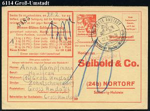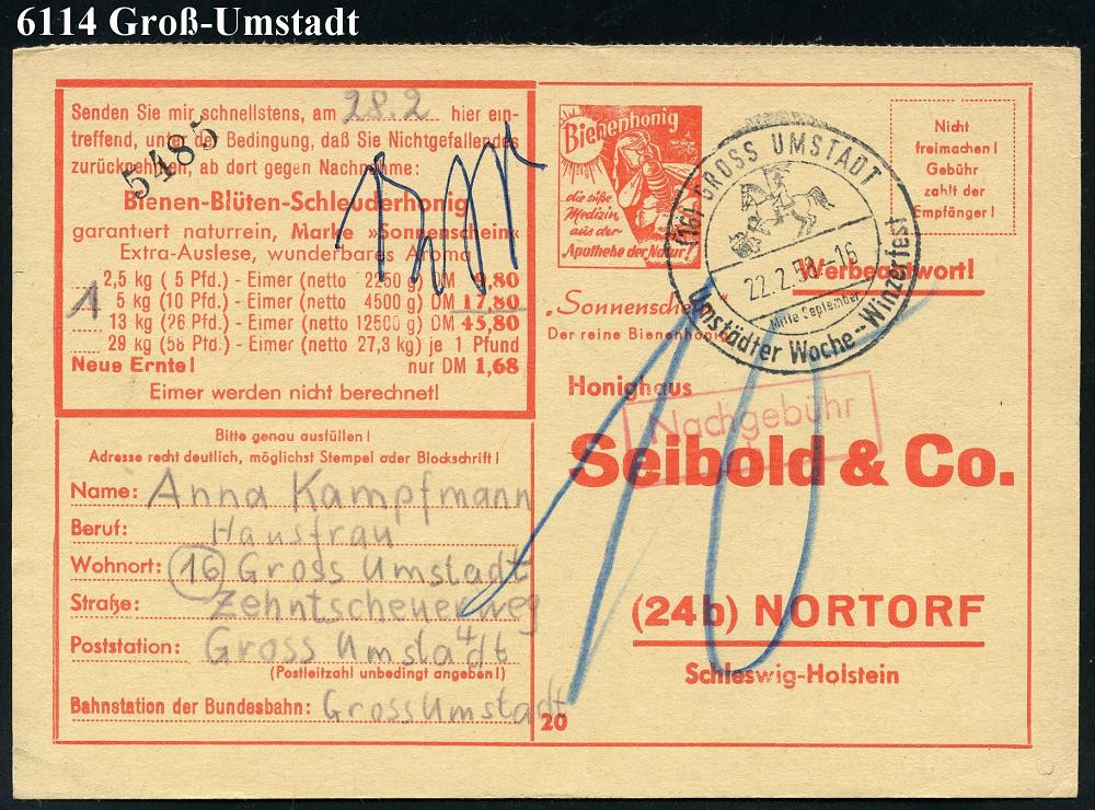 1206 | 12 € | POSTLEITRAUM 6100 (OHNE DARMSTADT) : (16) GROSS UMSTADT/ Umstädter Woche-Winzerfest 1958 (22.2.) HWSt (Reiter mit Wimpel) auf unfrankierter Bienenhonig-Bestellkarte + roter Ra.: Nachgebühr ("10" Pf. Werbeantwort) n. Nortorf (Bo.6) | ![]() | |