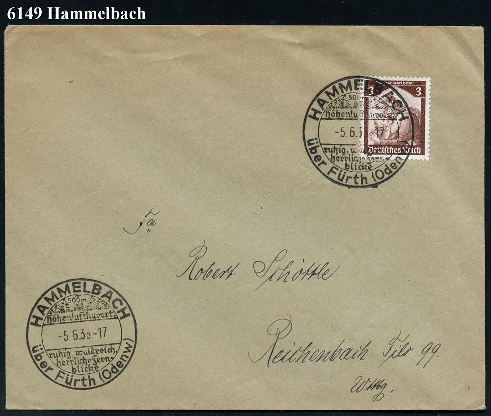 1207 | 18 € | POSTLEITRAUM 6100 (OHNE DARMSTADT) : HAMMELBACH/ Höhenluftkurort../ über Fürth (Odenw) 1936 (5.6.) HWSt (Tannen) 2x klar auf Fern-Bf. (Bo.1 , nur 1936-37 verwendet!) | ![]() | |