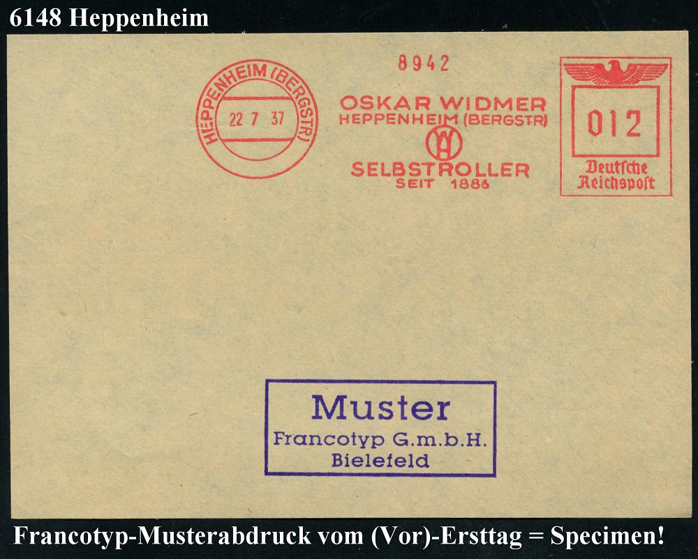 1208 | 35 € | POSTLEITRAUM 6100 (OHNE DARMSTADT) : HEPPENHEIM (BERGSTR)/ OSKAR WIDMER/ ..SELBSTROLLER/ SEIT 1886 1937 (22.7.) AFS-Musterabdruck Francotyp "Reichsadler" (Firmen-Logo) glasklar gest. Francotyp-Musterblatt vom (Vor)-Ersttag!, selten! (Dü.E-5CGh) | ![]() ![]() | |