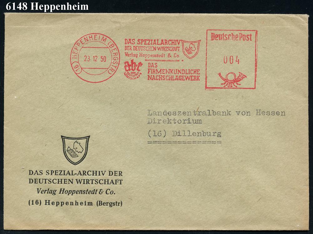 1210 | 12 € | POSTLEITRAUM 6100 (OHNE DARMSTADT) : (16) HEPPENHEIM (BERGSTR)/ DAS SPEZIALARCHIV/ DER DEUTSCHEN WIRTSCHAFT/ Verlag Hoppenstedt.. 1950 (23.12.) AFS Postalia "Posthorn" (Merkurkopf) motivgl. Firmen-Bf. (Dü.E-20 B) | ![]() | |