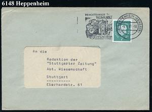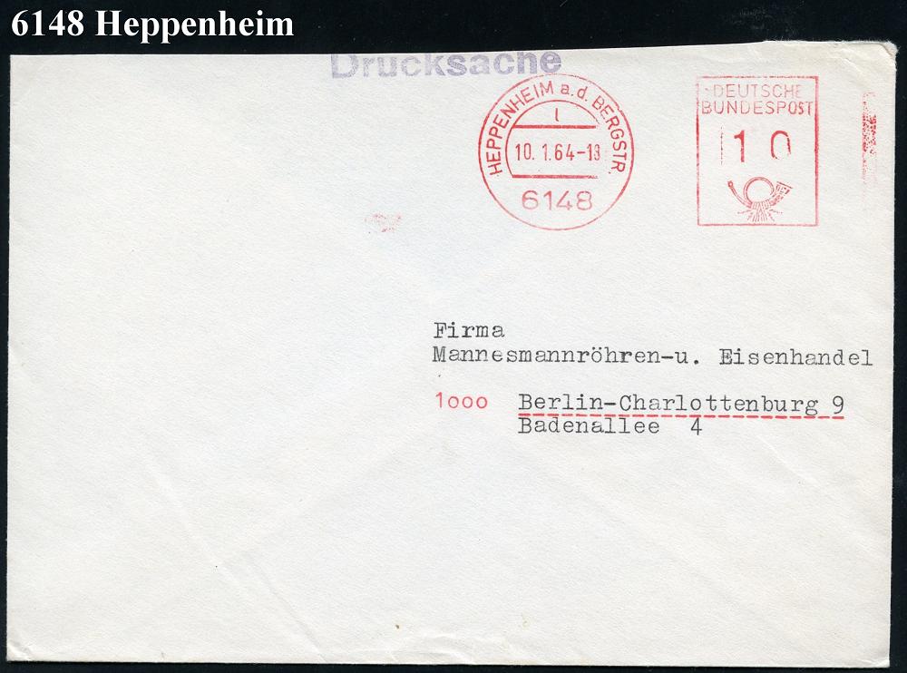 1213 | 10 € | POSTLEITRAUM 6100 (OHNE DARMSTADT) : 6148 HEPPENHEIM a.d.BERGSTR./ DEUTSCHE/ BUNDESPOST 1964 (10.1.) PFS 10 Pf. "Posthorn" auf Inl.-Drs. (rs. fehlt Klappe) (Dü.D-17) | ![]() | |