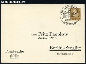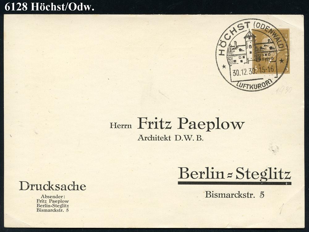 1214 | 16 € | POSTLEITRAUM 6100 (OHNE DARMSTADT) : HÖCHST (ODENWALD)/ LUFTKURORT 1930 (30.12.) HWSt = Kloster auf PP 3 Pf. Ebert, braun (F.Paeplow..) schwache Eckbugspur, glasklar gest.! (Bo.1) | ![]() | |