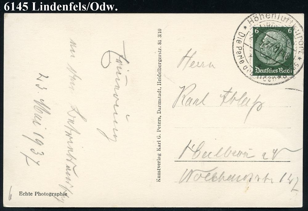 1220 | 14 € | POSTLEITRAUM 6100 (OHNE DARMSTADT) : LINDENFELS/ Höhenluftkurort/ Die Perle des Odenwaldes 1937 (23.5.) HWSt auf s/w.-Foto-Ak.: Lindenfels.. (Verlag Peters, Darmstadt) Bedarf (Bo.1) | ![]() ![]() | |