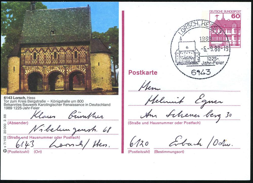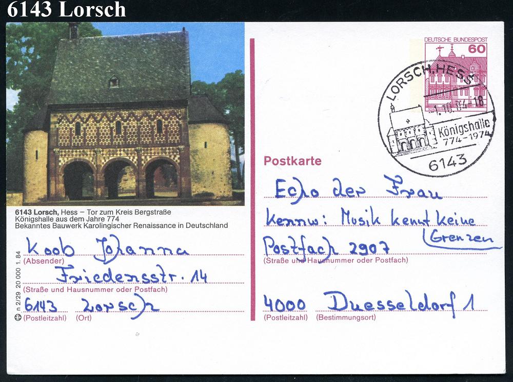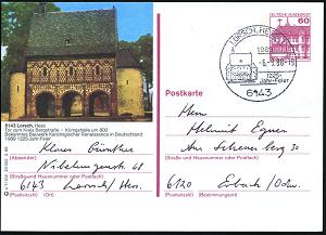 1225 | 14 € | POSTLEITRAUM 6100 (OHNE DARMSTADT) : 6143 LORSCH,HESS/ Königshalle/ 774.. 1984 (11.10.) HWSt aug orts- u. motivgl. BiP 60 Pf. Burgen: Königshalle des Klosters (Mi.P138) Bedarf!, seltene Kombination! (Bo.5) | ![]() | |