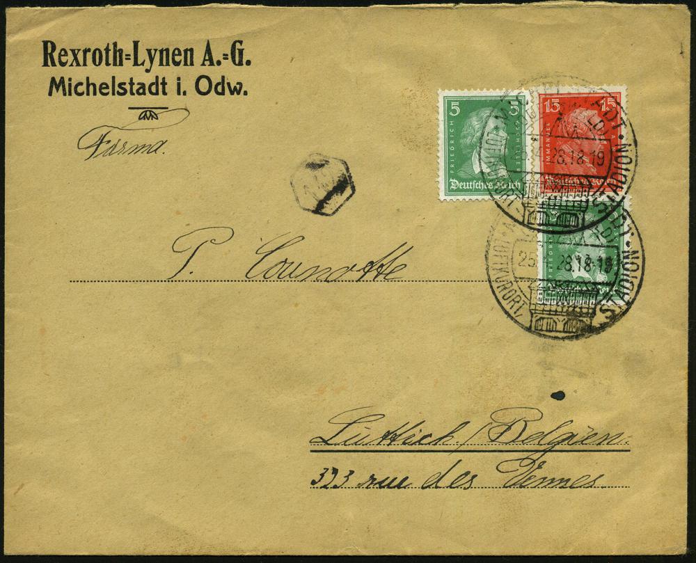 1228 | 25 € | POSTLEITRAUM 6100 (OHNE DARMSTADT) : MICHELSTADT/ (ODENWALD)/ LUFTKURORT/ STADION 1928 (25.41.) seltener HWSt (Fachwerk-Rathaus) 2x klar auf Ausl.-Firmen-Bf.: Rexroth-Lynen AG (Bo.1) | ![]() | |