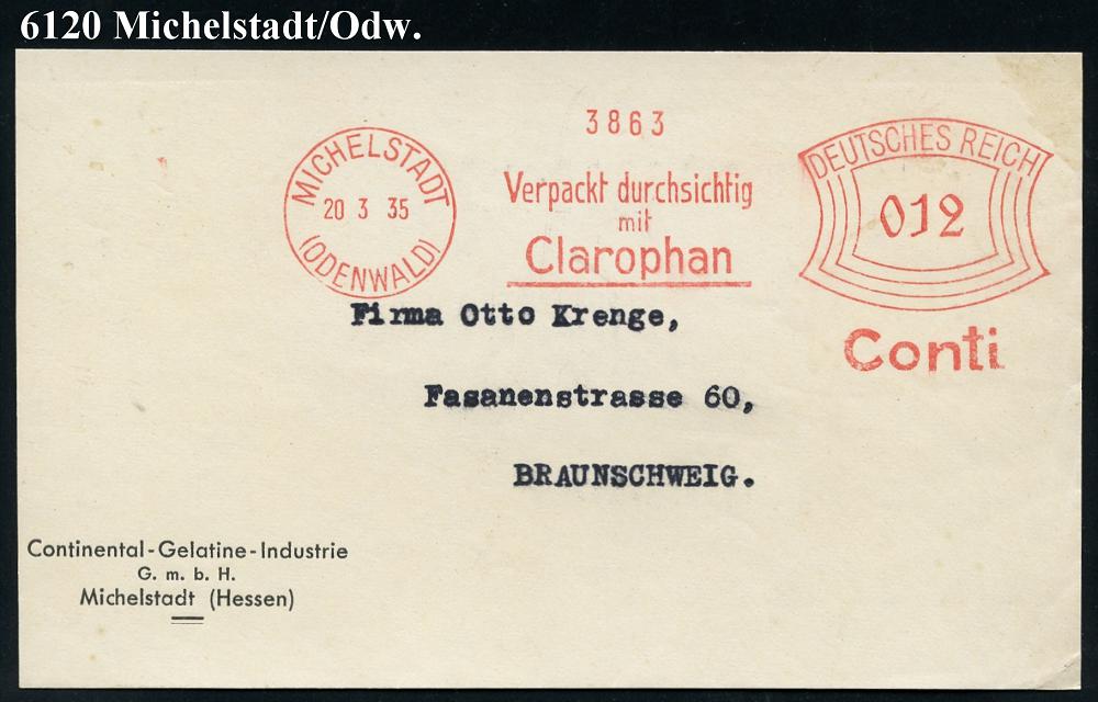 1229 | 18 € | POSTLEITRAUM 6100 (OHNE DARMSTADT) : MICHELSTADT/ (ODENW)/ Verpackt durchsichtig/ mit/ Clarophan/ Conti 1935 (29.3.) seltener AFS Francotyp "Bogenrechteck" klar auf kleiner Firmen-Vorderseite: Continental-Gelatine-Industrie GmbH.. (Dü.E-1CEh) | ![]() ![]() | |