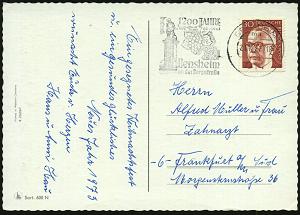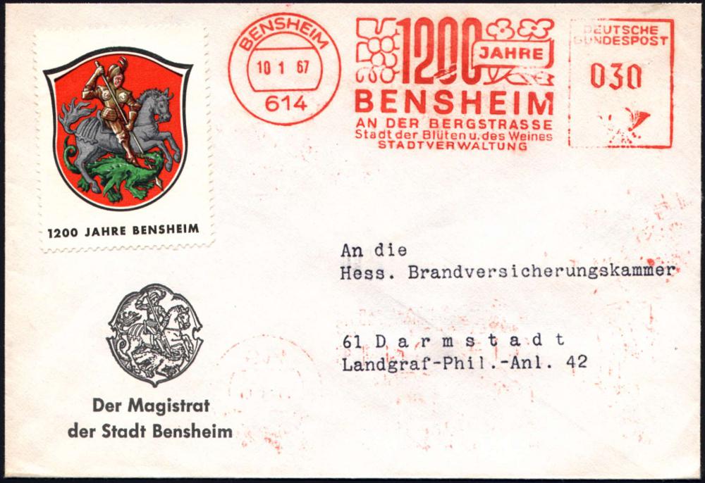 1183 | 15 € | POSTLEITRAUM 6100 (OHNE DARMSTADT) : 614 BENSHEIM/ 1200 JAHRE/ ..Stadt d.Blüten u.des Weines/ STADTVERWALTUNG 1967 (10.1.) Jubil.-AFS Francotyp + Jubil.-Color-Vign.: 1200 JAHRE BENSHEIM (St.Georg + Drachen) auf motivgl. kommunalem SU (Dü.E-23CG) | ![]() | |