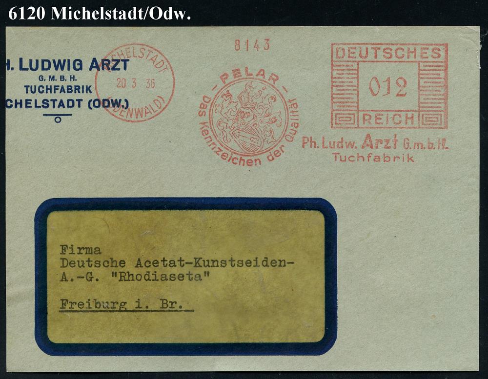 1230 | 15 € | POSTLEITRAUM 6100 (OHNE DARMSTADT) : MICHELSTADT/ (ODENW)/ PELAR../ Ph.Ludw.Arzt GmbH/ Tuchfabrik 1936 (20.3.) AFS Francotyp "Mäanderrechteck" auf (etw. verkürzter) Firmen-Vorderseite (Dü.E-2CEh) | ![]() | |