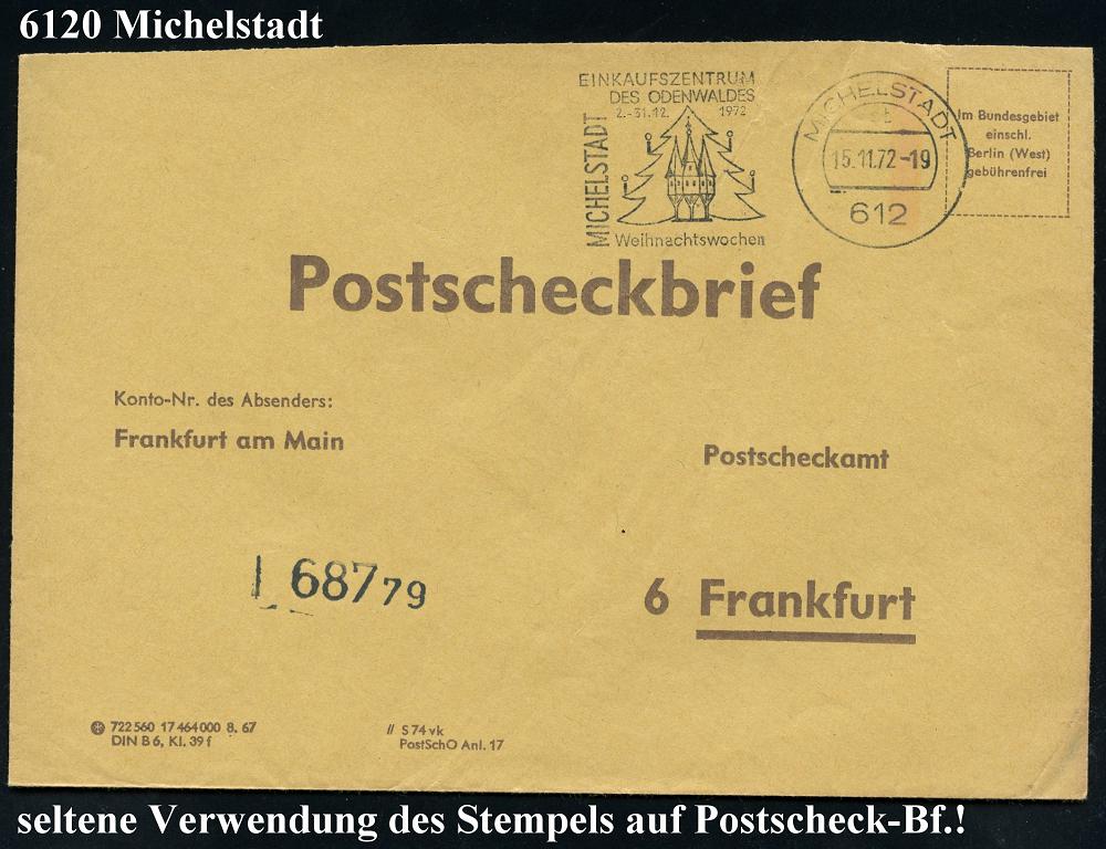 1234 | 14 € | POSTLEITRAUM 6100 (OHNE DARMSTADT) : 612 MICHELSTADT/ sb/ ..2.-31.12.1972/ Weihnachtswochen 1972 (15.11.) MWSt = Rathaus vor Tanne (im Ort gering schwach) auf gelbem PSch-Bf. = seltene Verwendung! (Bo.8 A) | ![]() | |