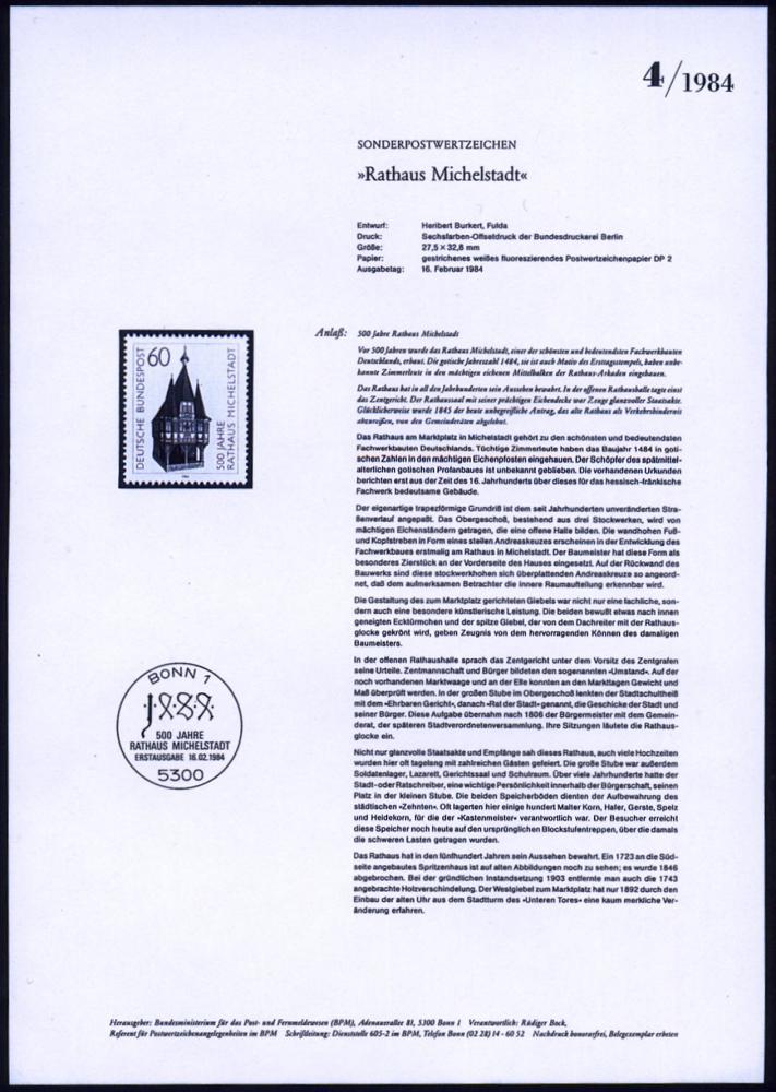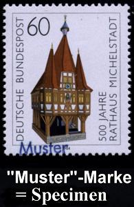 1237 | 28 € | POSTLEITRAUM 6100 (OHNE DARMSTADT) : Michelstadt 1984 (Febr.) 60 Pf. "500 Jahre Rathaus Michelstadt" mit amtl. Handstempel "M u s t e r" , postfr. + amtl. Ankündigungsblatt der Bundesdruckerei (Format A4) 2 Belege kompl., selten! (Mi.1200 Muster = Specimen) | ![]() ![]() | |
